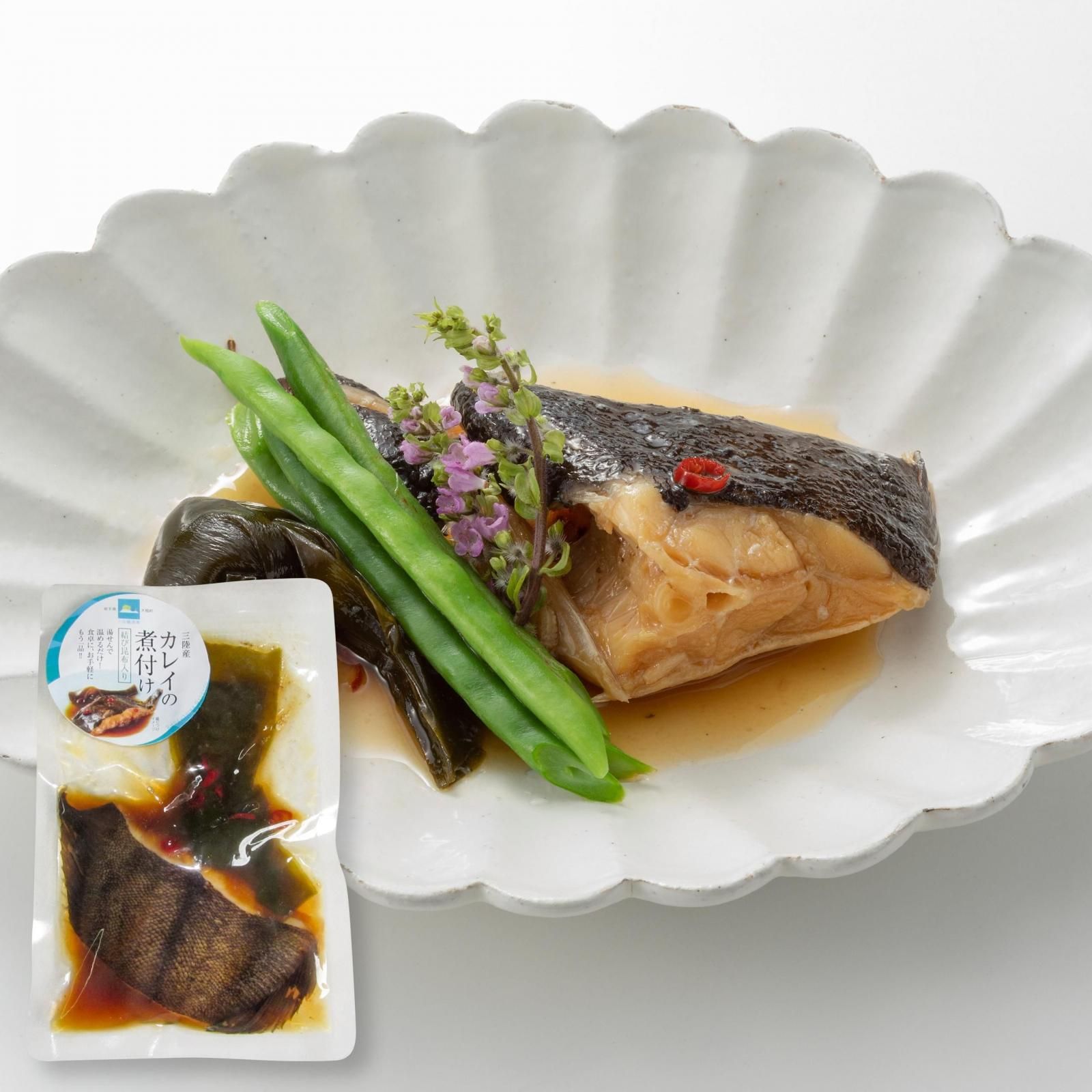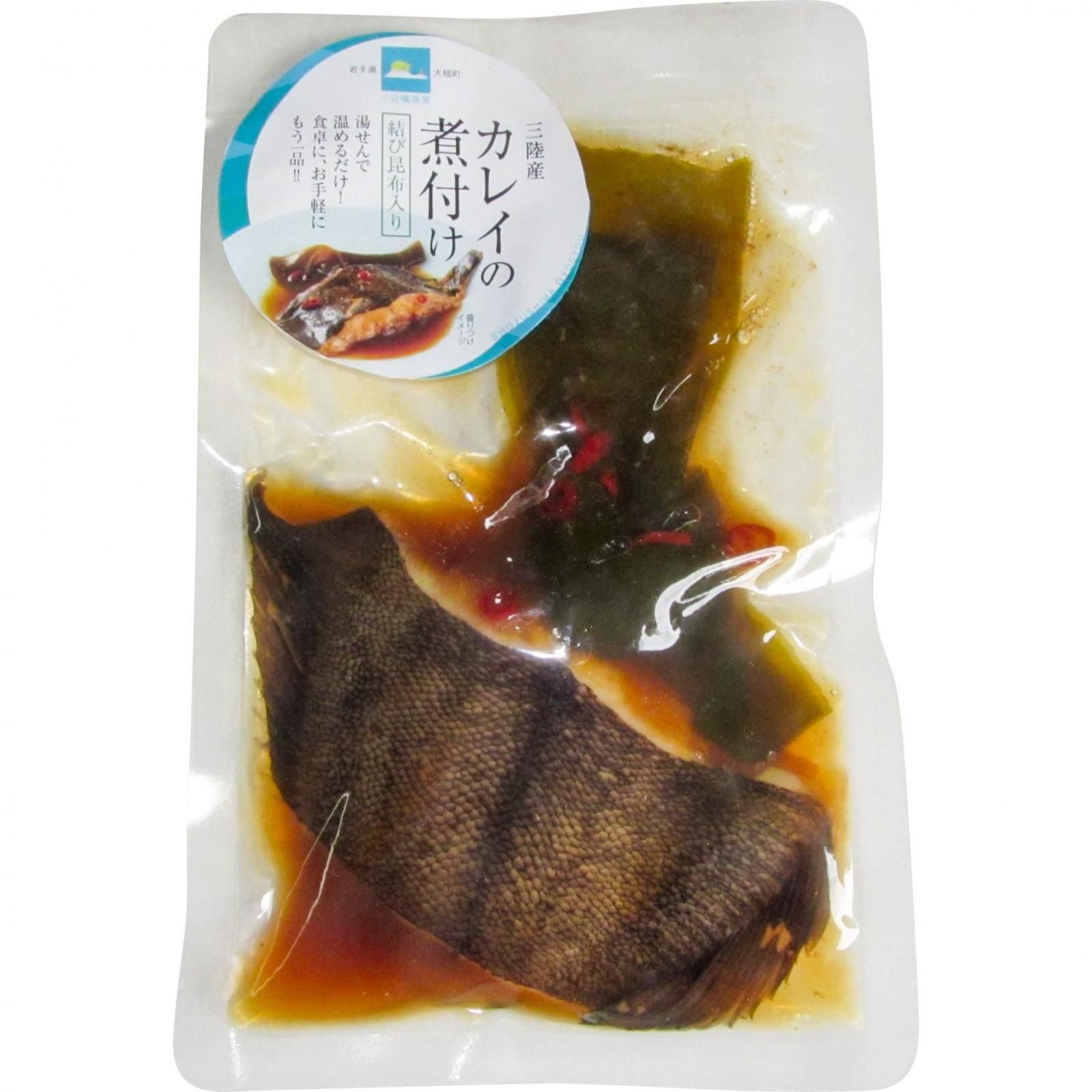 ■三陸産のカレイを使ったお煮付です。湯せんで温めるだけで、煮魚一品できあがり、結び昆布が入っていますので、盛り付けも程よく仕上がります。